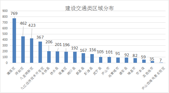 从诉求区域分布来看,建设交通类诉求在濂溪区、浔阳区及八里湖新区的分布量较大。庐山西海风景名胜区诉求量整体较少。