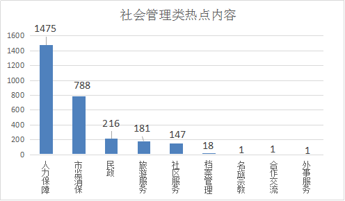 3.社会管理类诉求共2828件,其中人力保障居多,共1475件,占比52.16%;市监消保788件,占比27.86%;民政216件,占比7.64%;旅游服务181件,占比6.40%;社区服务147件,占比5.20%;档案管理18件,占比0.64%;民族宗教1件,占比0.04%;合作交流1件,占比0.04%;外事服务1件,占比0.04%。