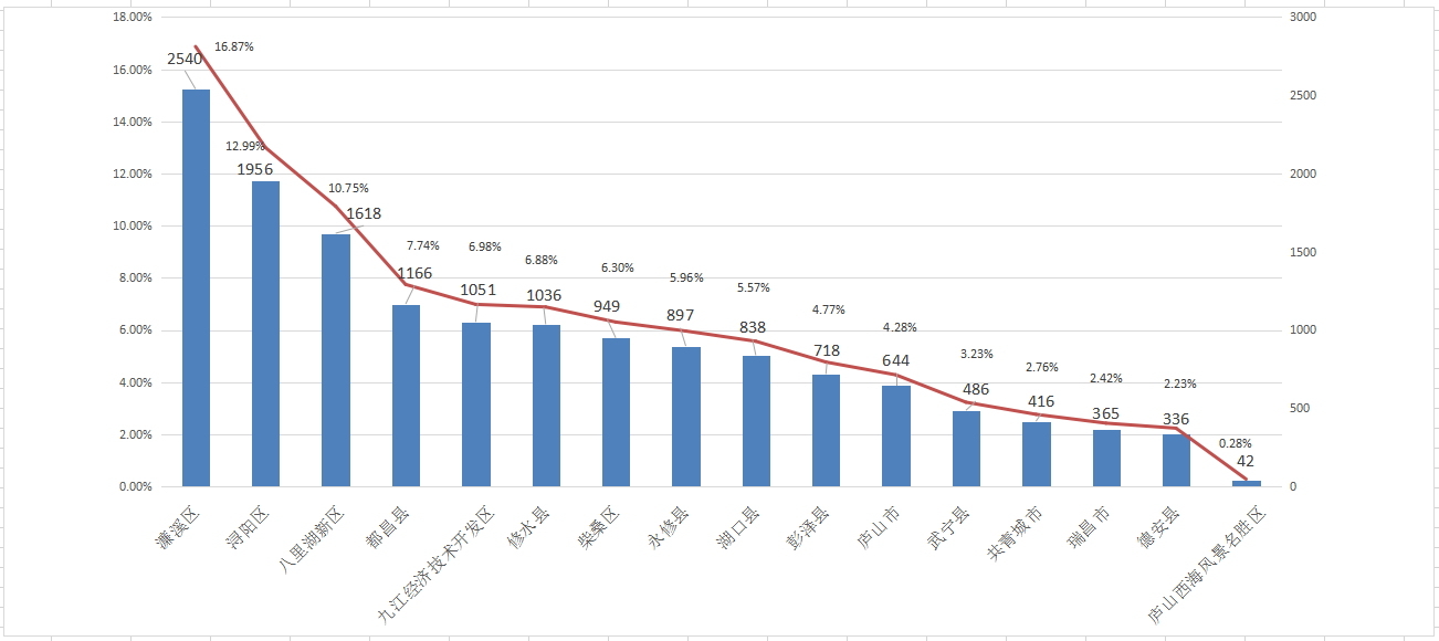 从市民诉求行政区域分布总体来看,10月份九江地区诉求工单共15058件。(说明:不包含市直单位数据)