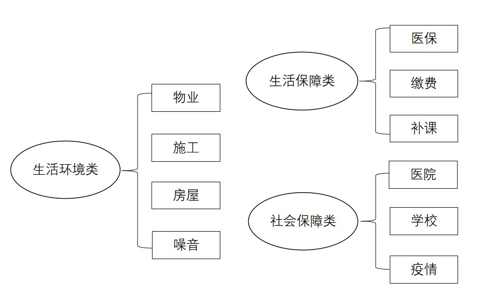 社会保障类诉求包括医院、学校、疫情三个热点,主要表现在咨询医院服务、学校补课及疫情政策等相关问题。