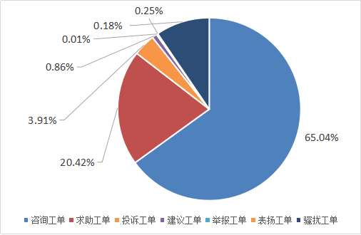 咨询类16443件,占比65.04%,主要涉及卫计健康、医疗医保、住房保障、人力保障、治安交管、市监消保、城乡建设、环境保护、交通港口等问题;