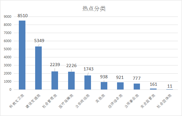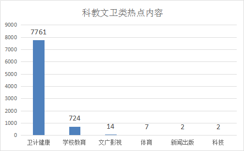 1.科教文卫类诉求共8510件,其中卫计健康居多,共7761件,占比91.20%;学校教育724件,占比8.51%;文广影视14件,占比0.17%;体育7件,占比0.08%;新闻出版2件,占比0.02%;科技2件,占比0.02%。