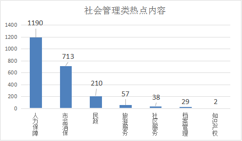3.社会管理类诉求共2239件,其中人力保障居多,共1190件,占比53.15%;市监消保713件,占比31.84%;民政210件,占比9.38%;旅游服务57件,占比2.54%;社区服务38件,占比1.70%;档案管理29件,占比1.30%;知识产权2件,占比0.09%。