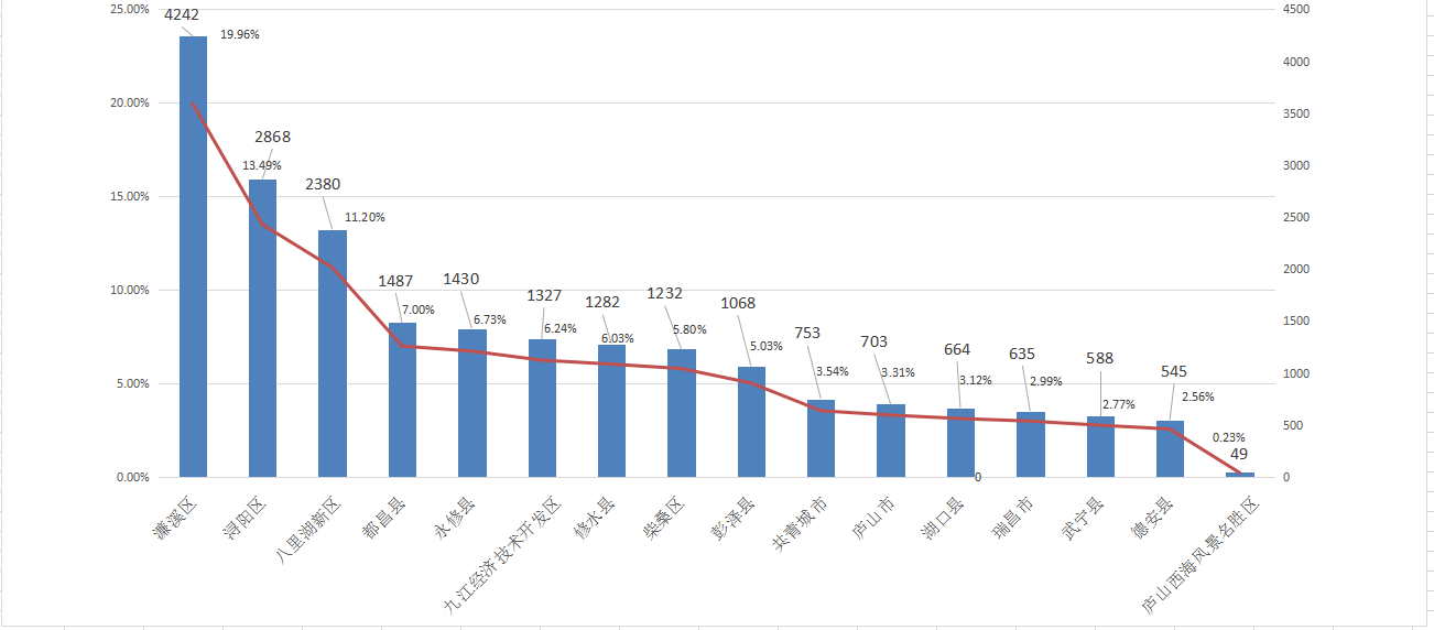 从市民诉求行政区域分布总体来看,5月份九江地区诉求工单共21253件。(说明:不包含市直单位数据)