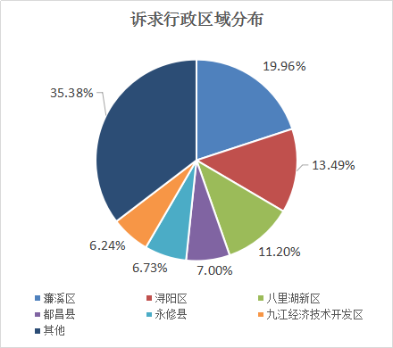 从市民诉求行政区域分布占比来看,濂溪区诉求量最高,共计4242件,占比19.96%;浔阳区诉求量其次,共计2868件,占比13.49%;八里湖新区诉求量第三,共计2380件,占比11.20%。