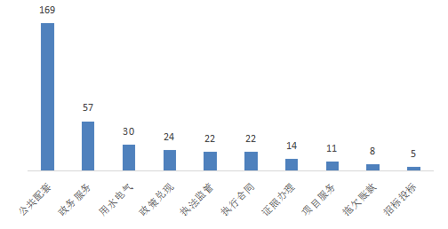 市场主体问题中,涉及公共配套169条、政务服务57条、用水电气30条、政策兑现24条、执法监管22条、执行合同22条、证照办理14条、项目服务11条、拖欠账款8条、招标投标5条。