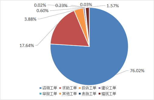 直接答复工单22578件(其中通过“热线来电”渠道受理工单17819件、“110转办件”渠道受理工单4666件、“邮箱”渠道受理工单46件、“省转办件”渠道受理工单31件、“官网”渠道受理工单9件、“APP”渠道受理工单7件),占比77.71%;
