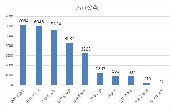 建议类173件,占比0.60%,主要涉及卫计健康、治安交管、城乡建设、绿化市容等问题;