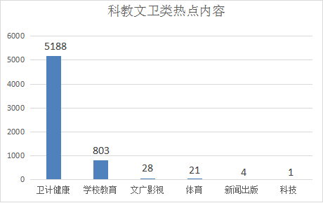 2.科教文卫类诉求共6045件,其中卫计健康诉求居多,共5188件,占比85.82%;教育803件,占比13.28%;文广影视28件,占比0.46%;体育21件,占比0.35%;新闻出版4件,占比0.06 %;科技1件,占比0.02%。