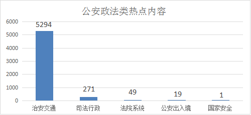 3.公安政法类诉求共5634件,其中治安交通居多,共5294件,占比93.97%;司法行政271件,占比4.81%;法院系统49件,占比0.87%;公安出入境19件,占比0.34%;国家安全1件,占比0.01%。