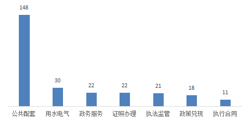 市场主体问题中,涉及公共配套148件、用水电气30件、政务服务22件、证照办理22件、执法监管21件、政策兑现18件、执行合同11件。