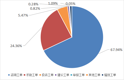 咨询类23067件,占比67.94%,主要涉及卫计健康、医疗医保、人力保障、住房保障、治安交管、市监消保、城乡建设、学校教育、环境保护等问题;