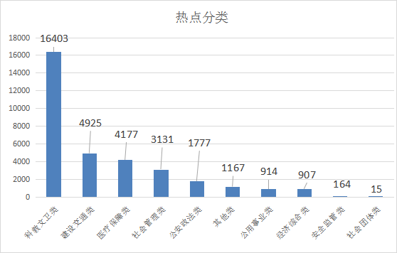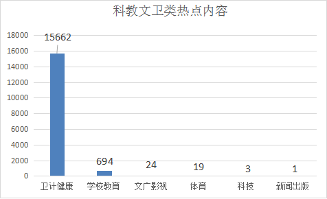 1.科教文卫类诉求共16403件,其中卫计健康诉求居多,共15562件,占比94.87%;学校教育694件,占比4.23%;文广影视24件,占比0.15%;体育19件,占比0.12%;科技3件,占比0.02%;新闻出版1件,占比0.01 %。