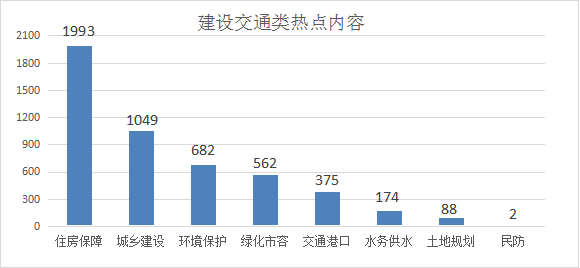 2.建设交通类诉求共4925件,其中住房保障居多,共1993件,占比40.47%;城乡建设1049件,占比21.30%;环境保护682件,占比13.85%;绿化市容562件,占比11.41%;交通港口375件,占比7.61%;水务供水174件,占比3.53%;土地规划88件,占比1.79%;民防2件,占比0.04%。