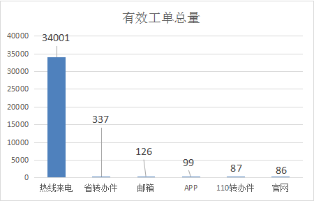 12345热线共登记有效工单34736件(其中通过“热线来电”渠道受理工单34001件、“省转办件”渠道受理工单337件、“邮箱”渠道受理工单126件、“APP”渠道受理工单99件、“110转办件”渠道受理工单87件、“官网”渠道受理工单86件)。