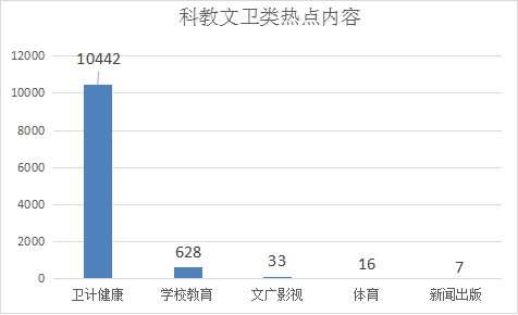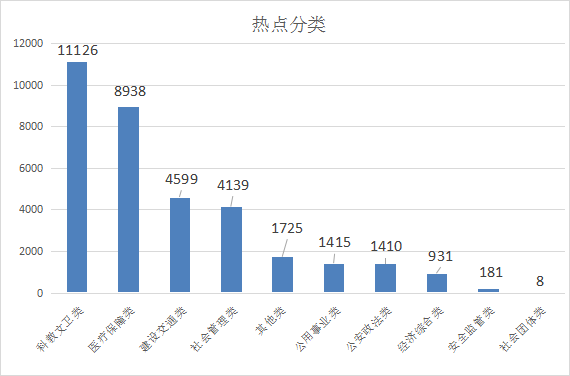 1.科教文卫类诉求共11126件,其中卫计健康诉求居多,共10442件,占比93.86%;学校教育628件,占比5.64%;文广影视33件,占比0.30%;体育16件,占比0.14%;新闻出版7件,占比0.06%。