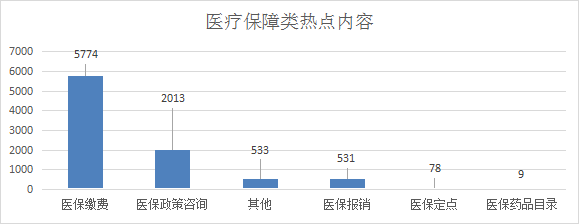 2.医疗保障类诉求共8938件,其中医保缴费居多,共5774件,占比64.61%;医保政策咨询2013件,占比22.52%;其他533件,占比5.96%;医保报销531件,占比5.94%;医保定点78件,占比0.87%;医保药品目录9件,占比0.10%。