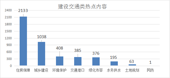 3.建设交通类诉求共4599件,其中住房保障居多,共2133件,占比46.38%;城乡建设1038件,占比22.57%;环境保护408件,占比8.87%;交通港口385件,占比8.37%;绿化市容376件,占比8.18%;水务供水195件,占比4.24%;土地规划63件,占比1.37%;民防1件,占比0.02%。