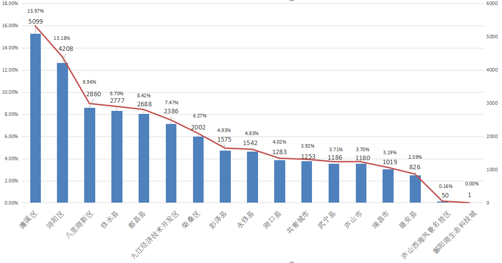 从企业群众诉求行政区域分布占比来看,濂溪区诉求量最高,共计5099件,占比15.97%;浔阳区诉求量其次,共计4208件,占比13.18%;八里湖新区诉求量第三,共计2860件,占比8.96%。