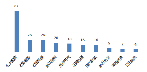 其中公共配套87条,占比最大,主要涉及店铺门头改造、公共区域被占用、下水管道堵塞漏水等问题。