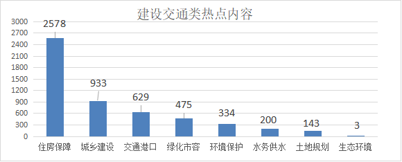 1.建设交通类诉求共5295件,其中住房保障居多,共2578件,占比48.68%;城乡建设933件,占比17.62%;交通港口629件,占比11.88%;绿化市容475件,占比8.97%;环境保护334件,占比6.31%;水务供水200件,占比3.78%;土地规划143件,占比2.70%;生态环境3件,占比0.06%。