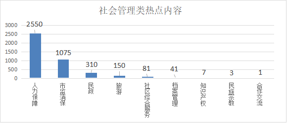 2.社会管理诉求共4218件,其中人力保障居多,共2550件,占比60.45%;市监消保1075件,占比25.49%;民政310件,占比7.35%;旅游150件,占比3.56%;社区综合服务81件,占比1.92%;档案管理41件,占比0.97%;知识产权7件,占比0.17%;民族宗教3件,占比0.07%;合作交流1件,占比0.02%。