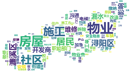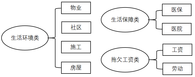 生活环境类诉求包括物业、社区、施工、房屋四个热点,主要表现在物业服务、社区服务、施工噪音、房屋拆迁等方面。
