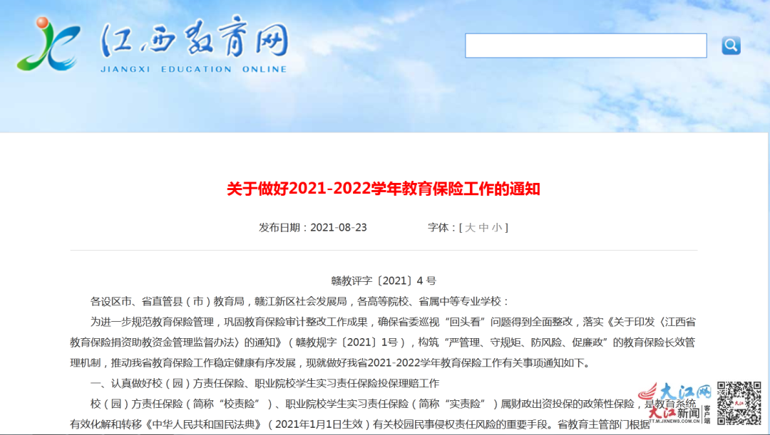 8月23日,江西省教育厅发布《关于做好2021-2022学年教育保险工作的通知》
