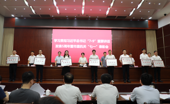 近日,市行政审批局在市直机关召开的学习贯彻习近平总书记“7·9”重要讲话发表五周年暨市直机关“七一”表彰会中,荣获“2023-2024年度‘模范机关’创建工作先进单位”,局机关第二党支部被命名为市直单位“四强”党支部,局窗口党支部书记黄巍同志荣获市直单位“优秀共产党员”称号。
