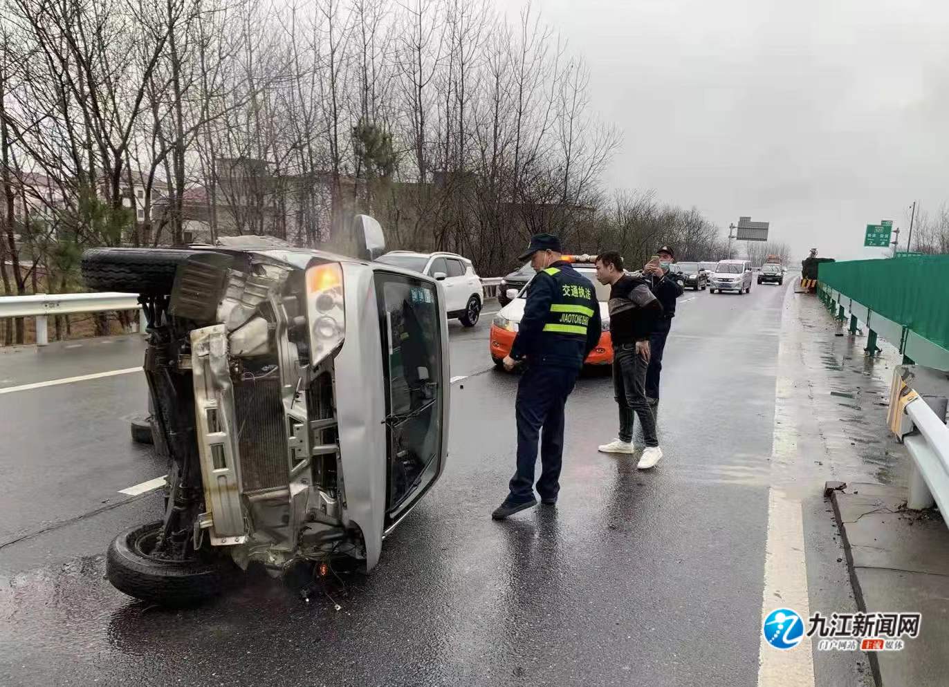 当日中午,浔阳区大队接高速交警联动通报,前往石钟山服务区联合执法,查获一台大型客运违法车。回程途中,在距湖口一公里处发现一起车辆侧翻事故,执法人员立刻展开紧急救援,救出车内被困人员1名,现场增设安全警示标志、疏导交通,提醒车辆减速慢行及避让。目前,路面已恢复畅通。
