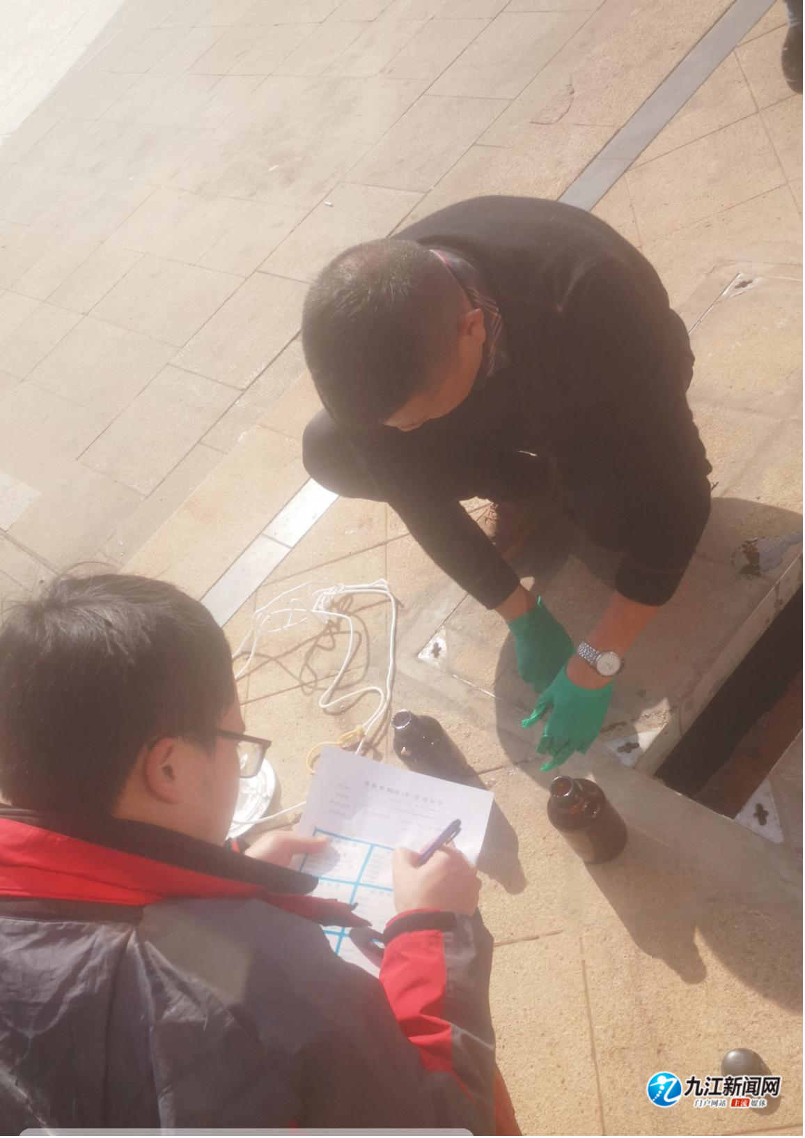 执法人员检测濂溪区迷踪蟹餐饮店排出的污水水质。