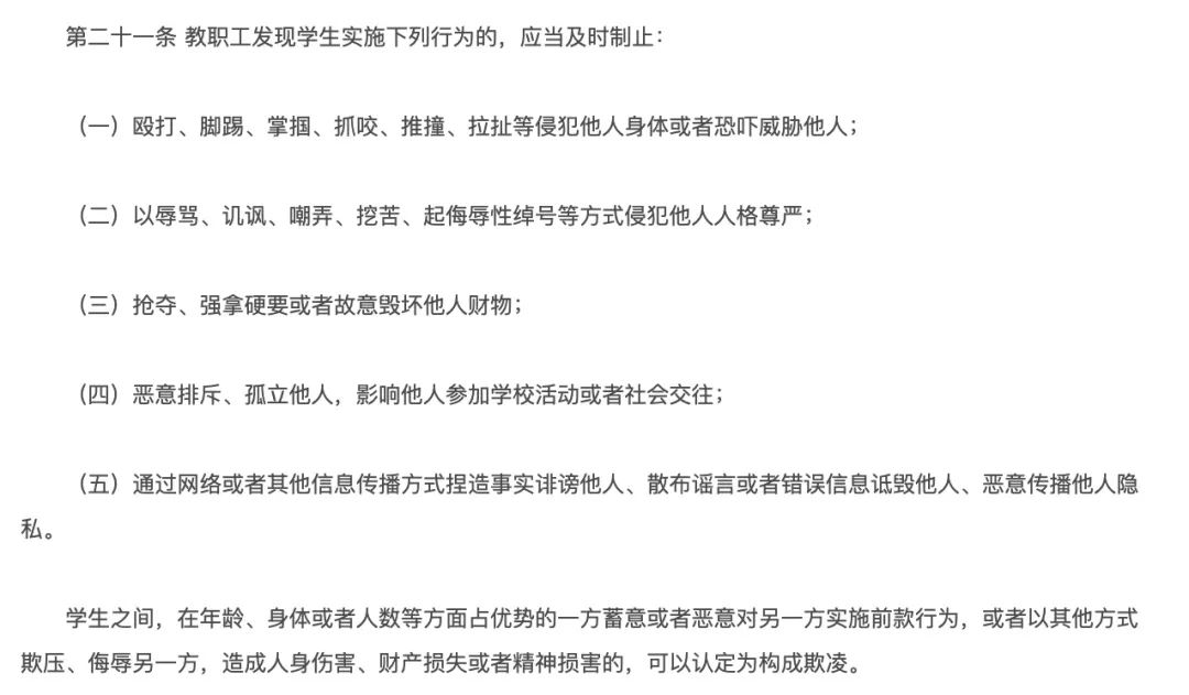 《未成年人学校保护规定》明确了欺凌的概念,要求学校应当定期针对全体学生开展防治欺凌专项调查,对学校是否存在欺凌等情形进行评估,并归纳了侵犯身体、侮辱人格、侵犯财产、恶意排斥、网络诽谤或传播隐私等以下五类欺凌行为:
