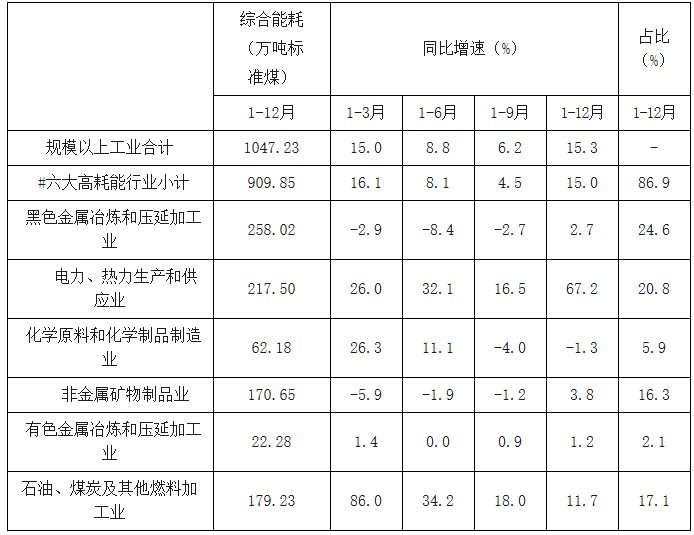 2018年,九江六大高耗能行业能耗增速由去年的“4升1降”变为今年的“5升1降”,综合能源消费量909.85万吨标准煤,同比增长15.0%,增幅比上年(1.8%)上升13.2个百分点,比1-9月上升了10.5个百分点。其中:黑色金属业综合能耗占比24.6%,电力行业综合能耗占比20.8%。