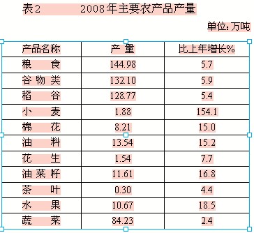 农业形势喜人。全年粮食种植面积达25.86万公顷,比上年增长3.4%,其中稻谷播种面积21.25万公顷,比上年增长2.5%;夏粮连续五年增收,全市粮食总产量达144.98万吨,增长5.7%。棉花种植面积4.91万公顷,增长1.2 %;棉花产量8.21万吨,增长15.0%。油料作物种植面积为9.56万公顷,比上年增长14.6%;油料产量13.54万吨,增长15.2%(见表2)。