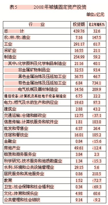 固定资产投资较快增长。全年全社会固定资产投资454.99亿元,比上年增长27.0%。其中,城镇固定资产投资439.76亿元,增长32.6%。在城镇投资中,第一产业投资7.16亿元,增长147.5%;第二产业投资294.05亿元,增长58.4%,其中工业投资达291.17亿元,增长61.7%;第三产业投资138.55亿元,下降3.1 %;非国有投资359.15亿元,增长41.1 %,占城镇投资的比重由上年的76.3%提高到81.7%。
