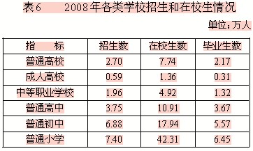 教育事业继续发展。全市共有普通高校7所,当年招生2.70万人,在校生7.74万人。各类中等、职业学校47所,在校生4.92万人。普通中学323所,在校生28.85万人,其中高中在校生10.91万人,初中在校生17.94万人。普通小学1306所,在校生42.31万人。初中阶段适龄人口入学率为98.93%,小学学龄儿童入学率为99.85%。成人高等专业学校招生0.59万人,在校生1.36万人。