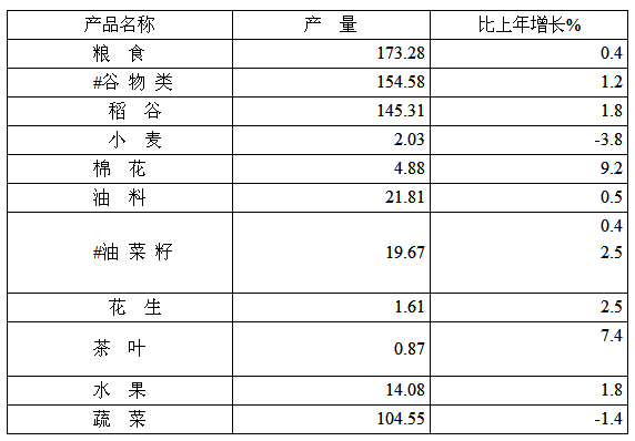 全年粮食作物播种面积28.52万公顷,下降0.5%;粮食产量173.28万吨,增长0.4%。油料作物播种面积12.5万公顷,下降3.3%;油料产量21.81万吨,增长0.5%。棉花播种面积3.16万公顷,增长5.7%;棉花产量4.88万吨,增长9.2%。