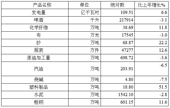 全年发电量109.51亿千瓦时,增长6.6%;原油加工量698.72万吨,下降3.6%;纱68.87万吨,增长22.2%;服装4.73亿件,增长12.6%;水泥1542.10万吨,下降2.8%;粗钢601.15万吨,增长11.6%。