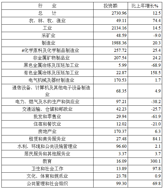全年固定资产投资2730.96亿元,比上年增长12.5%。分产业看,第一产业投资49.11亿元,增长74.4%;第二产业投资2134.16亿元,增长14.5%;第三产业投资547.69亿元,增长2.0%。非国有投资2454.11亿元,增长14.6%。全市亿元以上重大项目完成投资2341.22亿元,增长6.3%;其中亿元以上新开工项目完成投资1281.86亿元,增长49.8%。