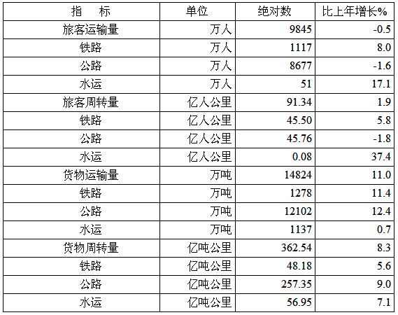 全年旅客运输量9845万人,比上年下降0.5%,其中,公路旅客运输量8677万人,下降1.6%;铁路旅客运输量1117万人,增长8.0%。货物运输量14824万吨,比上年增长11.0%,其中,公路货物运输量12102万吨,增长12.4%;铁路货物运输量1278万吨,增长11.4%。