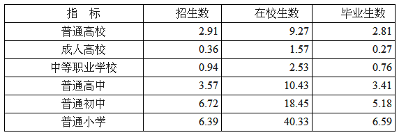 全市共有普通高校7所,当年招生2.91万人,在校生9.27万人。各类中等职业学校23所,在校生2.53万人。普通中学281所,在校生28.88万人,其中高中在校生10.43万人,初中在校生18.45万人。普通小学607所,在校生40.33万人。初中阶段适龄人口入学率为99.77%,小学学龄儿童入学率为100%。成人高等专业学校招生0.36万人,在校生1.57万人。