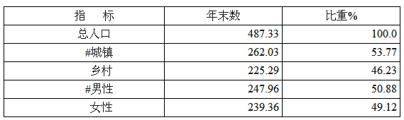 根据人口变动情况抽样调查统计,年末常住人口487.33万人,比上年末增长5.30‰。全年出生人口6.59万人,出生率13.55‰;死亡人口2.97万人,死亡率6.11‰;自然增长率7.44‰。