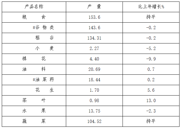 全年粮食作物播种面积27.03万公顷,下降4.3%;粮食产量153.60万吨,与上年持平。油料作物播种面积11.62万公顷,下降1.1%;油料产量20.69万吨,增长 0.7%。棉花播种面积2.85万公顷,下降9.8%;棉花产量4.40万吨,下降9.9%。