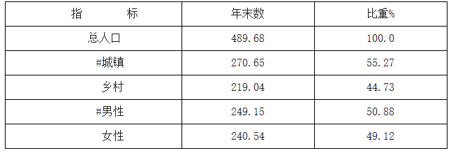 年末常住人口489.68万人,比上年末增加2.35万人。其中,城镇人口270.65万人,占总人口的比重(常住人口城镇化率)为55.27%,比上年末提高了1.5个百分点。户籍人口城镇化率为37.54%,比上年末提高2.93个百分点。全年出生人口6.42万人,出生率13.14‰,比上年下降0.41个千分点;死亡人口2.97万人,死亡率6.07‰,比上年下降0.04个千分点;自然增长率7.07‰,比上年下降0.37个千分点。