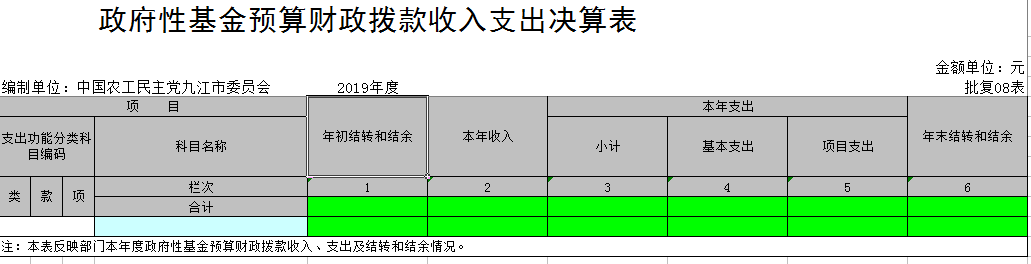 (八)上年结转和结余:填列2019年全部结转和结余的资金数,包括当年结转结余资金和历年滚存结转结余资金。