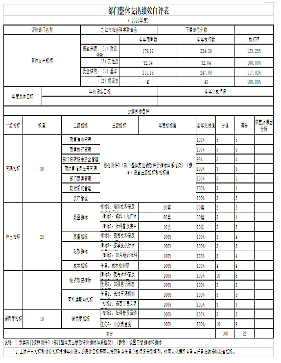 组织对中国社会科学联合会九江市社会科学界联合会等1个部门开展整体支出绩效评价试点,涉及一般公共预算支出206.98万元,政府性基金预算支出0万元。项目绩效自评总体综述:根据年初设定的绩效目标1、社科课题研究经费2、社会科学普及经费自评得分为92分。项目全年预算43万元,执行数为43万元,完成预算的100%。以上项目按照年初目标任务和资金预算情况稳步推进,为全市经济发展、社会稳定和谐取得了积极的成效。