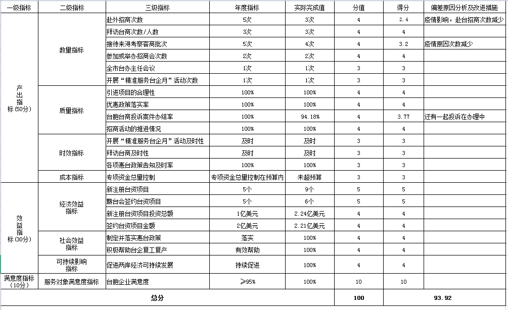 项目绩效自评总体综述:根据年初设定的绩效目标对台工作经费项目绩效自评得分为93.92分。项目全年预算数为62万元,执行数为40.58万元,完成预算的65.5%。