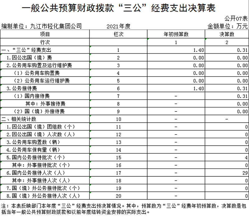 (二)公务接待费支出年初预算数为1.4万元,决算数为0.31万元,完成预算的22.14%,决算数较2020年增加0.08万元,增加34.78%,主要原因是:2021年因疫情影响未召开年度工作会,下面县手工业联社汇报工作次数有所增加。全年国内公务接待 4 批, 累计接待 29人次,其中外事接待 0 批,累计接待 0 人次,主要为:公务活动需要。
