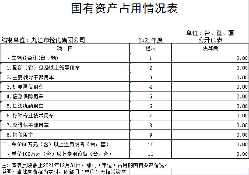 截止 2021 年 12 月 31 日,本单位国有资产占用情况见公 开 10 表《国有资产占用情况表》。其中车辆中的其他用车共有车辆 0 辆,执法执勤用车 0 辆,特种专业技术用车 0 辆、 其他用车 0 辆;单位价值 50 万元(含)以上通用设备 0 台 (套);单位价值 100 万元(含)以上专用设备 0 台(套)。