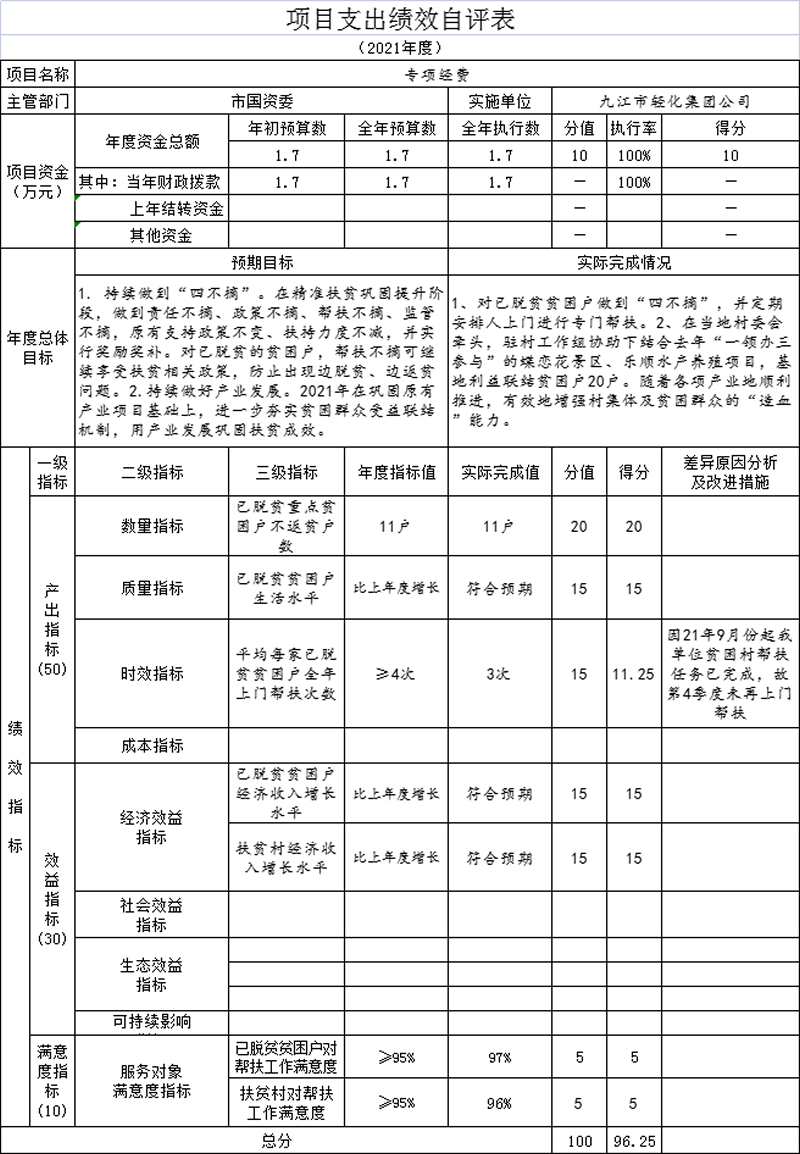 专项经费项目绩效自评综述:根据年初设定的绩效目标,自评得分为96.25分。项目全年预算数为1.7万元,执行数1.7万元,完成预算的100%。项目绩效目标完成情况:一是按时完成,全年支出1.7万元;二是效果好,为开展扶贫和帮企工作提供了必要保证。(附《项目支出绩效表》)